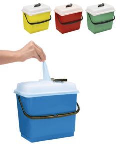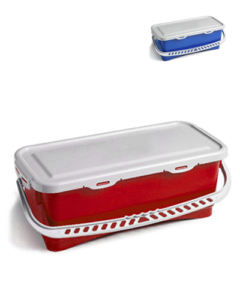- Dos cubos de 25 litros: asa azul (agua limpia) y asa roja (agua sucia).